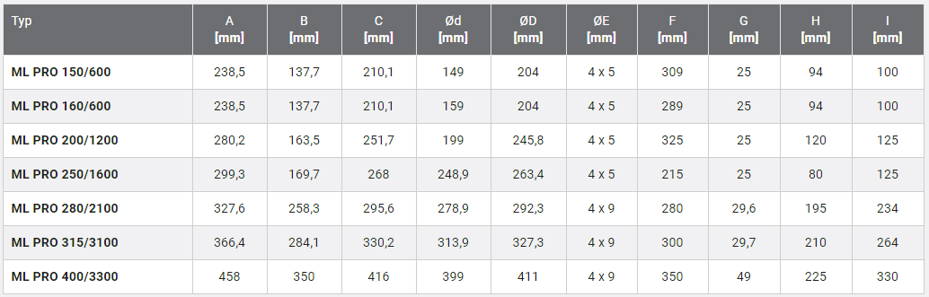 | ML PRO 250/1600 | 1625 | 440 | 160 | 230 | 0,8 | 2890 | 61 | 54 | 50 | 5,3 | 12731700 |