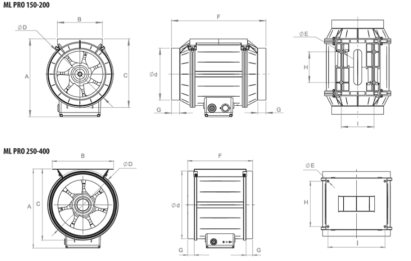 Wentylatory ML PRO wyposażono w specjalnie wyprofilowany wirnik diagonalny. Dodatkowe trójwymiarowe kierownice ograniczają burzliwość strumienia powietrza, oraz wyrównują prędkości przepływu w całym przekroju za wentylatorem. Zastosowane elementy aerodynamiczne znacznie redukują opory przepływającego powietrza, dzięki czemu wentylatory ML PRO osiągają jedne z najwyższych wartości sprawności w swojej klasie oraz charakteryzują się cichą pracą. Obudowę wykonano z wysokiej klasy tworzywa PPGF30 (polipropylen z dodatkiem 30% włókna szklanego, kolor RAL7012), odpornego na korozję oraz czynniki atmosferyczne.