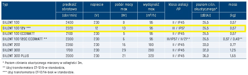 (porównanie z innymi modelami, na żółto zaznaczono wentylator z tej oferty)